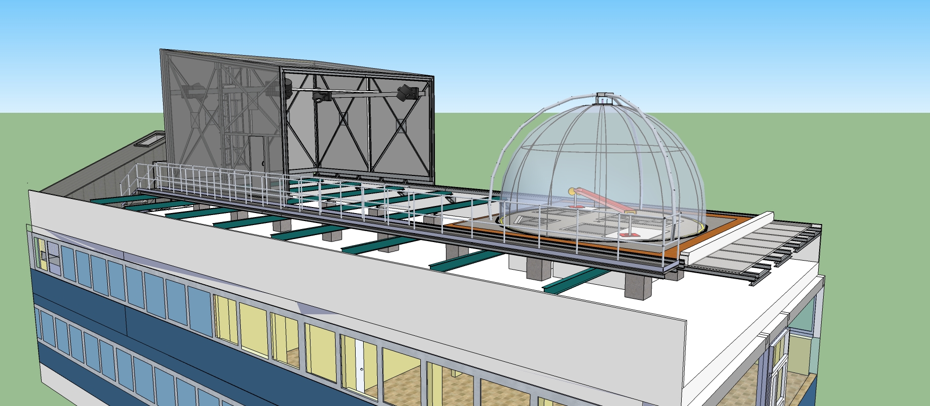 HELIOS is a large hemispherical outdoor simulation chamber (volume of 90 m³) positioned on the top of the ICARE-CNRS building at Orléans (47°50’18.39N; 1°56’40.03E). The chamber is made of FEP film (250 μm thick) ensuring more than 90 % solar light transmission. The chamber is protected against severe meteorological conditions by a mobile protective housing which contains a series of Xenon lamps enabling experiments to be conducted also using artificial light. This special design makes HELIOS a unique platform in Europe where experiments can be made using both types of irradiation. HELIOS is dedicated mainly to the investigation of gas-phase processes and radical chemistry under different conditions (sunlight, artificial light and dark). It is equipped with a wide range of state-of-the-art instruments for physical and chemical characterization of trace gases and aerosols. The available range of complementary and highly sensitive instruments allows the investigation of radical chemistry, gas-phase processes and aerosol formation under realistic conditions. |